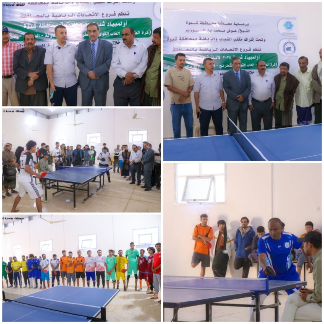 في أجواء رياضية احتفالية مبهرة، وبرعاية كريمة من محافظ محافظة شبوة الشيخ عوض محمد بن الوزير، دشّن أمين عام المجلس المحلي بمحافظة شبوة الأستاذ عبدربه هشله ناصر ومعه وكيل المحافظة مشرف قطاع الشباب الأستاذ سالم عبدالله الأحمدي ومدير عام مكتب الشباب والرياضة بالمحافظة الأستاذ محسن عوض سنان ، صباح اليوم انطلاق فعاليات أولمبياد شبوة الرياضي الأول، وذلك في صالة الفقيد أحمد الجبيلي بمدينة عتق، وسط حضور جماهيري واسع ومشاركة رسمية ورياضية لافتة.