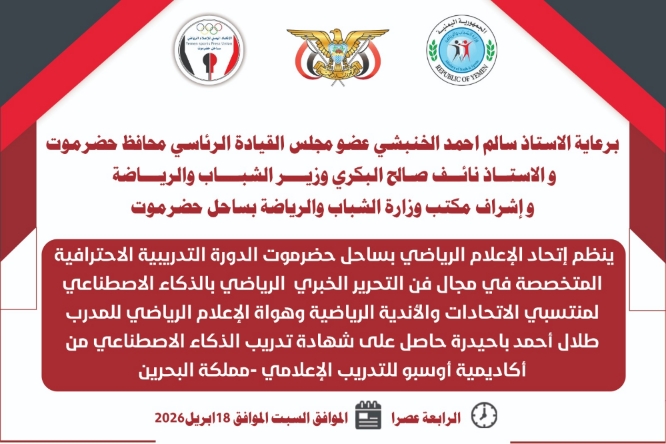 ينظم إتحاد الإعلام الرياضي بساحل حضرموت عصر غد السبت الموافق الثامن عشر من أبريل 2026 الدورة التدريبية الاحترافية المتخصصة في مجال فن التحرير الخبري الرياضي بالذكاء الاصطناعى برعاية *الاستاذ سالم احمد الخنبشي عضو مجلس القيادة الرئاسي محافظ حضرمو *والاستاذ نائف صالح البكري* وزير الشباب والرياضة وإشراف مكتب وزارة الشباب والرياضة بساحل حضرموت.