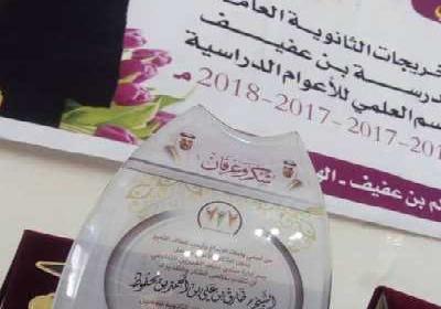 وكما قدمت إدارة المنتدى شهادات شكر وتقدير لمدرسات مدرسة بن عفيف.ثم اختتم التكريم بتكريم باقي الخريجات بشهادات تفوق لجهودهم المبذولة في سبيل الارتقاء بالعلم.