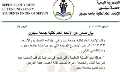 ومن خلال المعاناة التي یعیشھا الطلبة فإننا في الإتحاد العام لطلبة جامعة سیئون نؤكد ونطالب بالأتي:-