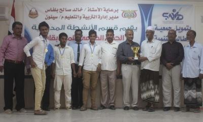 واختتم الحفل بتكريم ادارة التربية والتعليم بمديرية سيئون وادارة مكتب جمعية الطالب التنموية المدارس والثانويات الحكومية والاهلية الفائزة بدروع وشهادة مشاركة كما تم تكريم فرق المدارس الرياضية المشاركين في مسابقة تنس الطاولة والشطرنج بالكوؤس و الميداليات الذهبية والفضية .