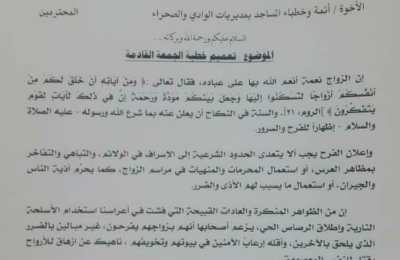 اصدر مكتب الاوقاف والارشاد بالوادي والصحراء تعميماً عاماً لخطباء وائمة
