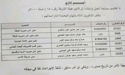 لما تقضيه مصلحة العمل واستنادا الى قانون هيئة الشرطة رقم ( 15 ) لسنة 2000م يكلف المذكورين ادناه بالمهام المحددة امام اسمائهم :