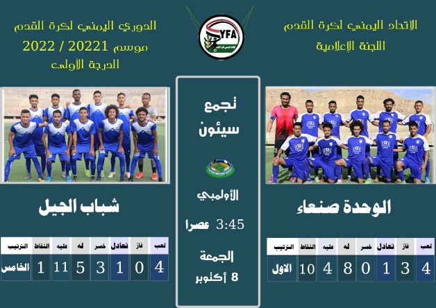 يلعب اليوم الجمعة الثامن من سبتمبر على استاد سيؤون الأولمبي في المباراة قبل الأخيرة لختام مباريات الذهاب من دوري الدرجة الأولى لكرة القدم (المجموعة الأولى ) وحدة صنعاء متصدر الترتيب وشباب الجيل الجريح متذيل الترتيب.. المواجهة تبدو سهلة لوحدة صنعاء المتصدر ب "عشر" نقاط،