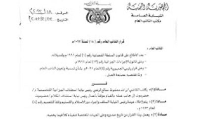 أصدر النائب العام احمد بن احمد الموساي قرار رقم ( 18 ) لسنة 2022 قض بمايلي : المادة الاولى : يكلف القاضي / رائد محفوظ صالح لرضي رئيس نيابة استئناف الجزائية المتخصصة م/ حضرموت الى جانب عمله بالقيام مؤقتا باعمال رئيس استئناف المكلا م/ حضرموت .