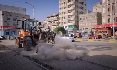 مشروع النظافة بالمكلا يشن حملة نظافة مكثفة لإزالة تراكمات الأتربة بالشوارع الرئيسية