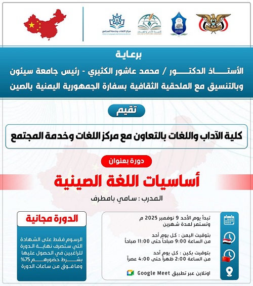 برعاية رئيس جامعة سيئون الأستاذ الدكتور محمد عاشور الكثيري، وبالتنسيق مع المستشار الثقافي بسفارة الجمهورية اليمنية بالصين الدكتور محمد الأحمدي انطلقت صباح أمس الأحد الموافق 9 نوفمبر 2025م الدورة الأولى في "أساسيات اللغة الصينية"، التي نظّمتها كلية الآداب واللغات بالتعاون مع مركز اللغات وخدمة المجتمع بالجامعة، ونفّذ الدورة المهندس سامي بامطرف عبر تطبيق Google Meet من جمهورية الصين الشعبية.