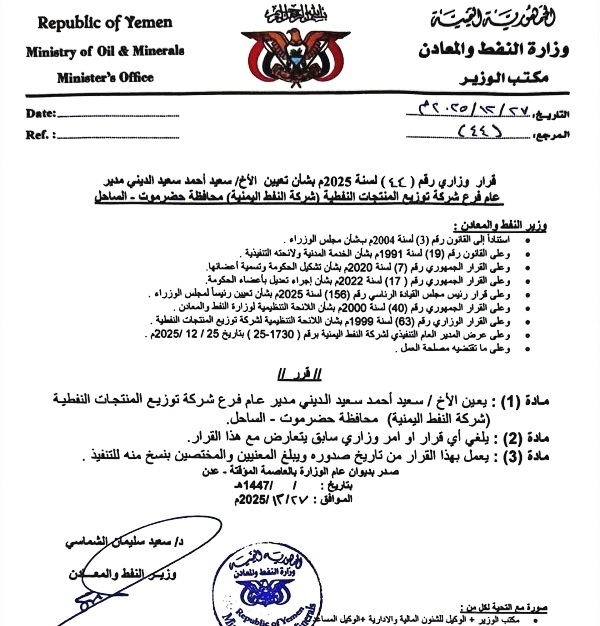 أصدر معالي وزير النفط والمعادن، الدكتور سعيد سليمان الشماسي، اليوم الأحد 28 ديسمبر 2025م، قراراً وزارياً رقم (44) لسنة 2025م، قضى بتكليف قيادة جديدة لفرع شركة توزيع المنتجات النفطية (شركة النفط اليمنية) في محافظة حضرموت – الساحل، في خطوة تهدف إلى تعزيز الأداء الإداري وضمان استقرار الإمدادات النفطية.. جاء في القرار:
