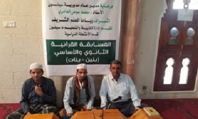 مثل مدرسة السيدة عائشة الفائزة بالمركز الأول في مسابقة الخمسة أجزاء من القرآن الكريم الطالبتان: ( أمجاد ياسر عبد شعبان ) و ( مروى محمد عبد بن عامر ) ، ومثل مدرسة السيدة فاطمة الفائزة بالمركز الثاني في مسابقة الخمسة أجزاء من القرآن الكريم. الطالبتان: ( شيماء عبدالحافظ باسيف) و ( أنوار أنور عصبان ).