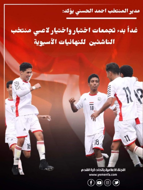 اكد الكابتن احمد الحسني مدير المنتخب الوطني للناشئين ان تجمعات اختيار لاعبين جدد لضمهم لقائمة المنتخب الحالية ستنطلق يوم غد الاثنين بإقامة تجمع عدن والذي يضم لاعبي أندية عدن على ملعب المنصورة