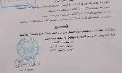 أصدر رئيس الجامعة الأستاذ الدكتور محمد عاشور الكثيري قراراً رقم 4 لعام