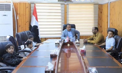العامري، في مكتبه بمدينة سيئون، بإدارة وطلاب مدرسة الأمل لذوي الهمم