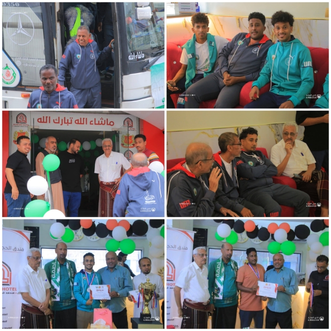 و بمناسبة وصول البعثة اقامت ادارة فندق و صالة الحجاز ممثلة بمديرها الأستاذ / علي بامعس برنامج تكريمي مصغر لإدارة النادي و أعضاء البعثة ( جهاز فني و اداري و لاعبين) وفاء و رسالة تحفيز لمزيد من النجاحات في مشوار الاخضر المكلاوي العريق ، وتخلل البرنامج التكريمي كلمات معبرة عن المناسبة و المرحلة القادمة التي تتطلب استمرارية التكاتف و العمل بروح الفريق لتحقيق المزيد من الانتصارات القاءها كل من الاساتذة/ أنور الجعيدي رئيس النادي ، فياض باعامر و حسن صالح مسجدي والذين تم تكريمهم من ادارة فندق بدرع تذكاري تقديرا لجهودهم التي تهدف إلى تطوير الحركة الرياضية في حضرموت .