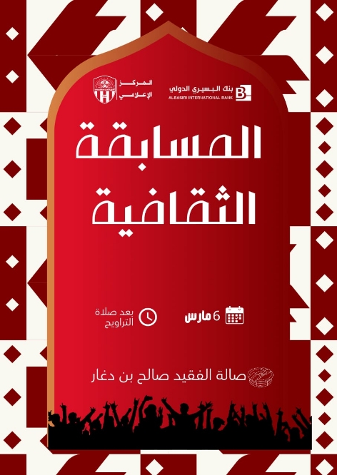 ضمن فعاليات مهرجان رمضان الرياضي الذي يقيمه نادي شعب حضرموت، تحتضن صالة الفقيد صالح بن دغار مساء يوم غدٍ منافسات المسابقة الثقافية التي تجمع عدداً من الفرق الشعبية، في أجواء تنافسية مميزة تعكس روح المعرفة والتفاعل الثقافي بين المشاركين.