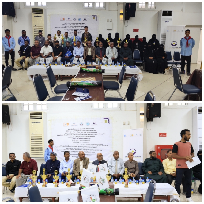 في أجواء مفعمة بالحماس والنشاط اختتمت بقاعة الفقيد علي هود باعباد برئاسة جامعة حضرموت منافسات بطولتي تنس الطاولة والشطرنج، والتي أقيمت ضمن فعاليات أسبوع الطالب الجامعي الـ15 بمشاركة واسعة من طلاب وطالبات كليات الجامعة وبرعاية رئيس الجامعة الأستاذ الدكتور محمد سعيد خنبش وبالتنسيق مع مكتب وزارة الشباب والرياضة بساحل حضرموت وبالشراكة مع مركز خدمات الشباب حضرموت ومنظمة شباب بلا حدود للتنمية، وبتمويل صندوق الأمم المتحدة للسكان .