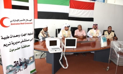 سلمت هيئة الهلال الأحمر الإماراتي، اليوم الخميس، مجموعة أجهزة ومستلزمات طبية، مقدمة الى مستشفى مديرية تريم بوادي حضرموت.