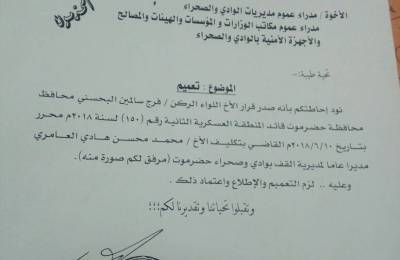 بناء على قرار محافظ حضرموت رقم (150) لسنة 2018م محرر2018/6/10م اصدر وكيل