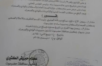 صدر اليوم بديوان وكيل محافظة حضرموت لشؤون مديريات الوادي الصحراء القرار