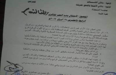 وجاء في نص العريضة الصادرة عن مكتب وزارة السياحة بساحل حضرموت الممضية من قبل محافظ المحافظة، أن يشارك مالكي الفنادق والأجنحة والشقق المفروشة فرحة استقبال ذكرى التحرير وذلك عن طريق التزين بالأضواء والإنارات البراقة منذ الـ20 من إبريل وحتى الـ24 من إبريل.