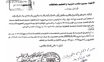 يتم تعليق الدراسة في جميع المدارس الحكومية والأهلية والخاصة، لمدة اسبوع ابتداءا من يوم الاثنين الموافق 16/ 3 / 2020م، قابل للتمديد في حال ما إذا ظهرت مستجدات بشأن انتشار فيروس كورونا لا سمح الله، يرجى الالتزام والمتابعة من قبلكم .